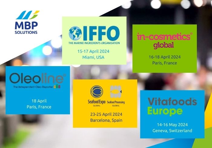 Delegates from MBP Solutions will attend the IFFO’s Members’ Meeting (15-17 April), In-Cosmetics Global (16-18 April), Oleoline 3rd Global Oleochemical Conference (18 April), Seafood Expo Global (23-25 April ) and Vitafoods Europe (14-16 May). We recognise the value of industry events as platforms for knowledge exchange and partner networking opportunities. Our presence reflects our ongoing commitment to sustainability and enables us to share our knowledge and solutions with the broader industry.